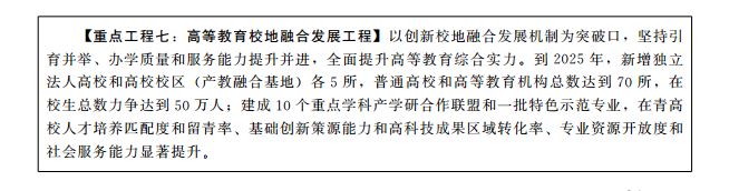 2.全方位增强融合发展能力。引导在青高校和高等教育机构主动融入城市重大战略部署,汇聚创新资源和要素,加强高水平应用研究,培育和建设高层次创新平台,推动高校围绕人工智能、集成电路、新能源新材料、生物医药等重点产业领域开展产学研协同创新,鼓励高校参与国家重大源头创新平台和产业技术创新战略联盟建设。引导高校优化学科设置,重点培育符合青岛产业布局和战略性新兴产业规划的专业,加快新工科、新医科、新农科、新文科建设,发展一批特色优势学科和新型交叉学科。实施在青高校产教融合示范专业建设计划,促进专业建设与产业发展深度融合。支持在青高校建立跨学科、跨专业的现代产业学院,建设技术转移转化基地,促进科技成果转移转化。鼓励支持高校面向学生开展创新型实验、创业训练、创业实践以及各类科技创新实践活动。支持引导高校面向社会开放重点实验室、工程技术研究中心和体育场馆等设施资源。深入实施结对高校联合育人计划,发挥高等教育对基础教育和职业教育的辐射带动作用。