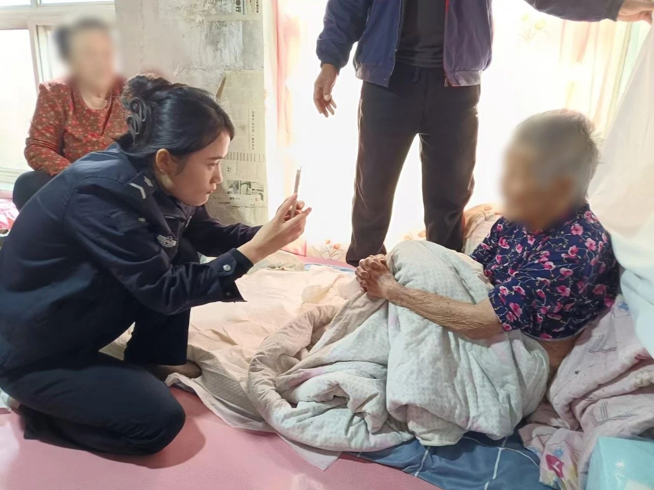 2024年11月19日上午,夏格庄派出所接到辖区大李家疃村一村民求助称:其母亲身份证不慎遗失,现急需办理,但因老人已经93岁,且已瘫痪在床多年,所以无法到派出所户籍大厅办理,希望民警能够设法帮其补办身份证。