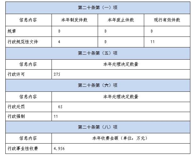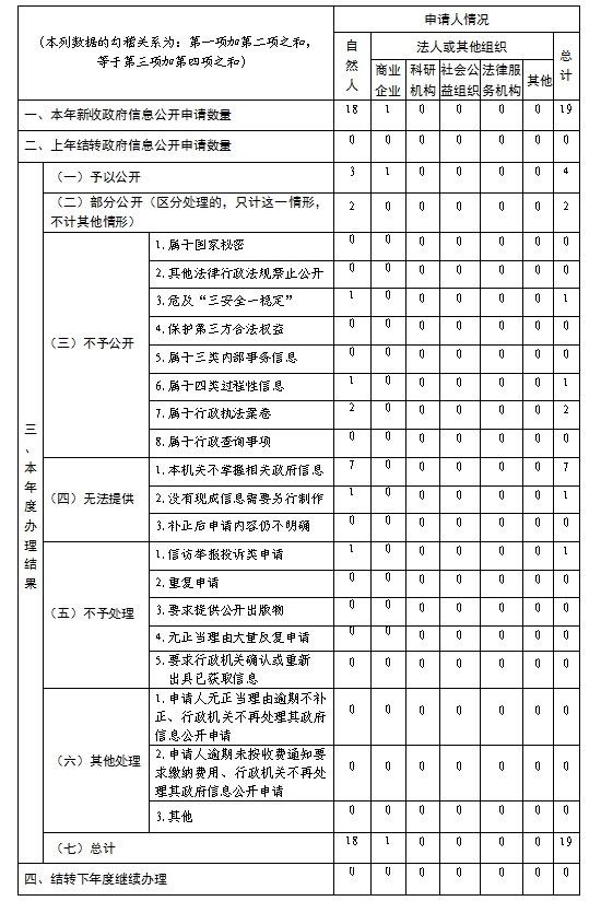 (二)政府信息依申请公开。共受理政府信息公开申请19件,已全部在规定期限内向申请人答复告知。从申请人属性来看,18件为自然人提出申请,1件申请为企业法人提出。从办理结果看,根据《条例》规定,对本单位受理的申请,同意公开的4件,占21.1%;部分公开的2件,占10.5%;不予公开的4件,占21.1%;无法提供的8件,占42.1%,其中,本机关不掌握相关政府信息的7件,占87.5%,没有现成信息需要另行制作的1件,占12.5%;因属投诉类申请不予处理的1件,占5.2%。本年度本单位全年没有因政府信息公开原因提起行政复议、行政诉讼情况。