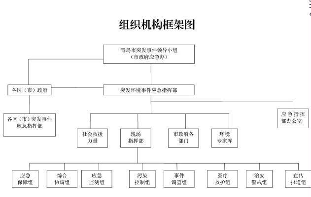青岛市突发环境事件应急组织体系由应急领导机构即青岛市突发环境事件应急指挥部(以下简称市环境应急指挥部)及其下设的办公室、现场指挥部、应急工作组、专家组、区(市)政府突发环境事件应急组织体系组成(详见附件3)。
